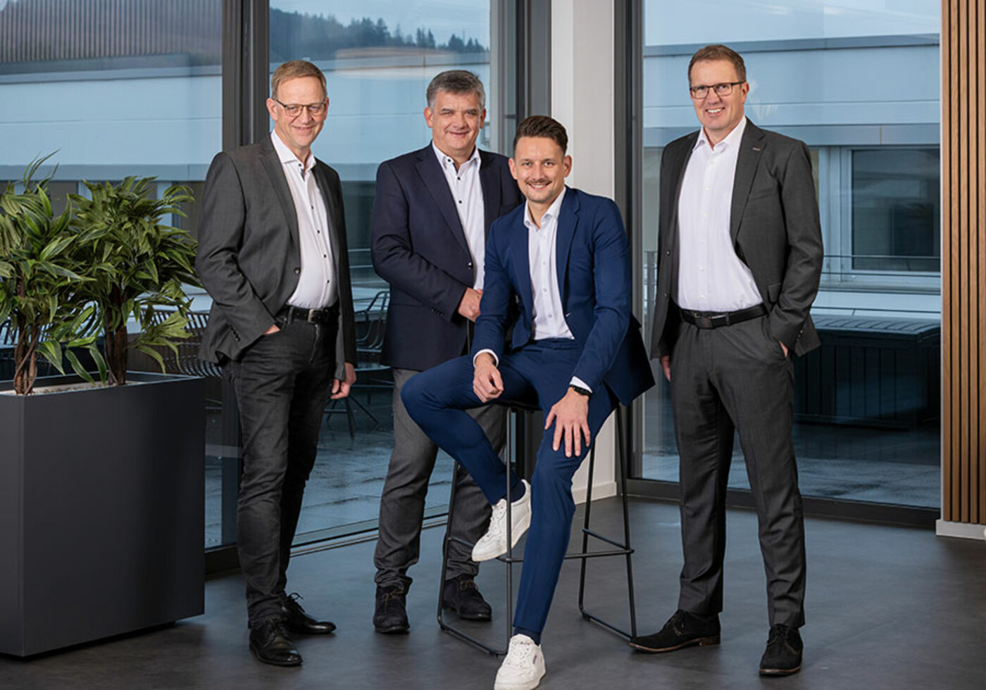 Bild 2: Zusammen mit den langjährigen Geschäftsführern Andreas Wetter (Mitte) und Volker Lauber (links) führen Jost Wetter (vorne) und Marco Beimborn das Familienunternehmen K+G Wetter in die zukunftsorientierte dritte Generation.