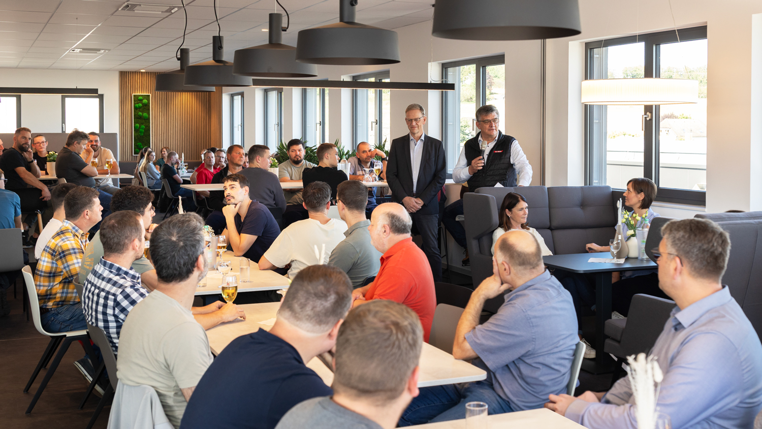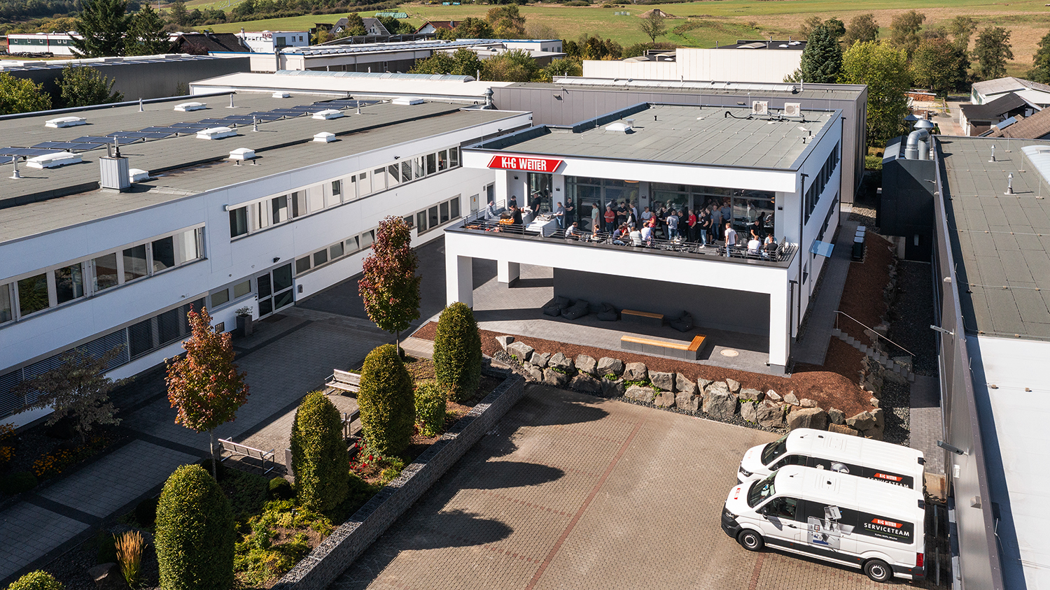Und auch Kunden und Geschäftspartner von K+G Wetter profitieren von der Investition, die ein weiterer Meilenstein in der 35-jährigen Unternehmensgeschichte ist. Seit 1990 baut K+G Wetter in Nordhessen hochwertige Kutter und Wölfe für die Lebensmittelverarbeitung – für Kunden auf der ganzen Welt. Nach den letzten Erweiterungen der Produktionsfläche 2018 und 2020 stehen im neuen Gebäude nun auch größere Räume für Besprechungen zur Verfügung. „Schulungen im Team, Austausch mit Kollegen oder Verkaufsgespräche mit Kunden sind jetzt mit optimaler technischer Ausstattung und flexibel aufteilbaren Räumen jederzeit und auch mit größeren Personengruppen möglich“, freut sich Andreas Wetter. „Ich bin sicher, dass wir mit dem neuen Gebäude die Zusammenarbeit spürbar verbessern – im Team, aber auch mit Geschäftspartnern.“